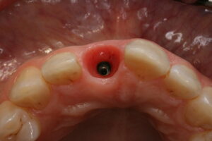 Derselbe Patient wie im Bild oben – bevor die Krone befestigt wurde. Hier sieht man den Implantataufbau, das Verbindungsteil zwischen dem Implantat, das fest in den Knochen eingewachsen ist, und der Zahnkrone. Damit die Farbe der Krone natürlich wirkt, wurde ein Implantataufbau aus Keramik gewählt. Vorher war hier eine unschöne Zahnlücke, die den Patienten zwang, eine Prothese zu tragen.